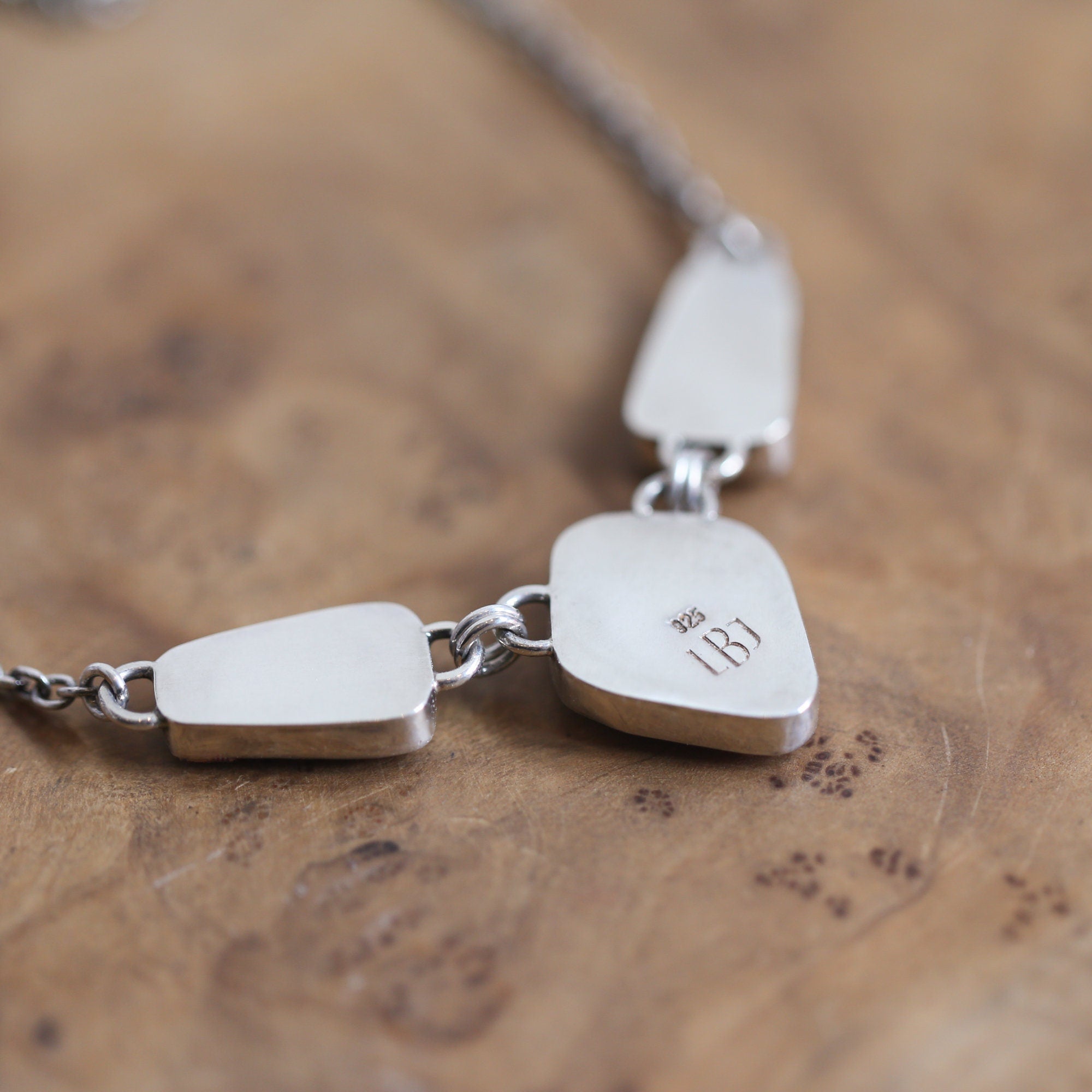This unique 3-stone, necklace design features 3 boldly colored and cut, burnt orange colored Spiny Oyster Shell Cabochons. Simply set in .925 Sterling Silver and linked together for a flexible and comfortable fit - it's easy to wear and always looks good. Dress this linked choker. up or down. We've integrated our favorite, .925 Sterling Silver chain which closes between 14.5 and 17.5 inches.